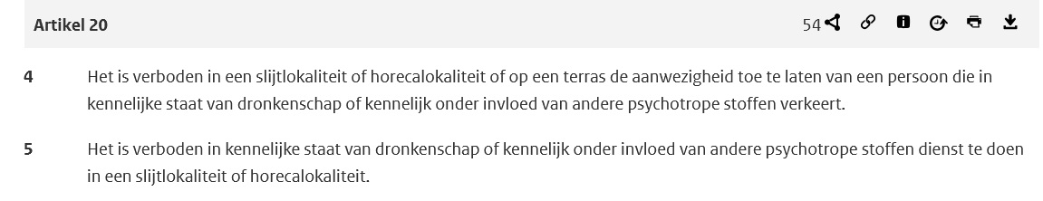 1. Want in de Alcoholwet staat dat de horeca de aanwezigheid van personen die ‘in kennelijke staat verkeren’ niet mag toelaten. Laat staan dat de horeca hen extra drank mag schenken.