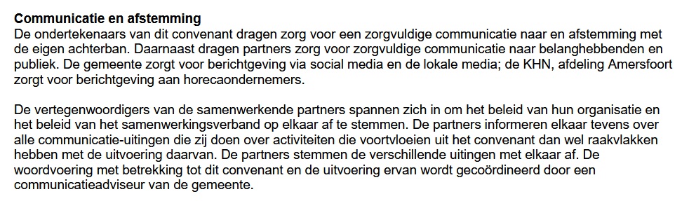 In het Covenant Veilig Uitgaan staat ook dat Politie, Horeca, Gemeente, Art.1 Midden Nederland en VRU alle communicatie naar het publiek via de gemeente laten lopen.