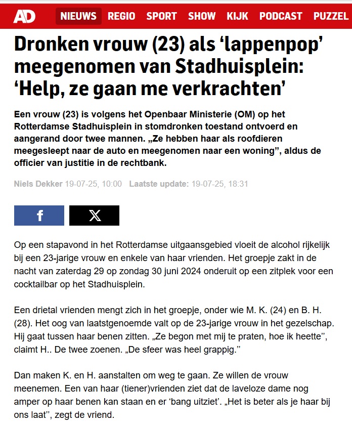 AD: Dronken vrouw (23) als ‘lappenpop’ meegenomen van Stadhuisplein: ‘Help, ze gaan me verkrachten’: